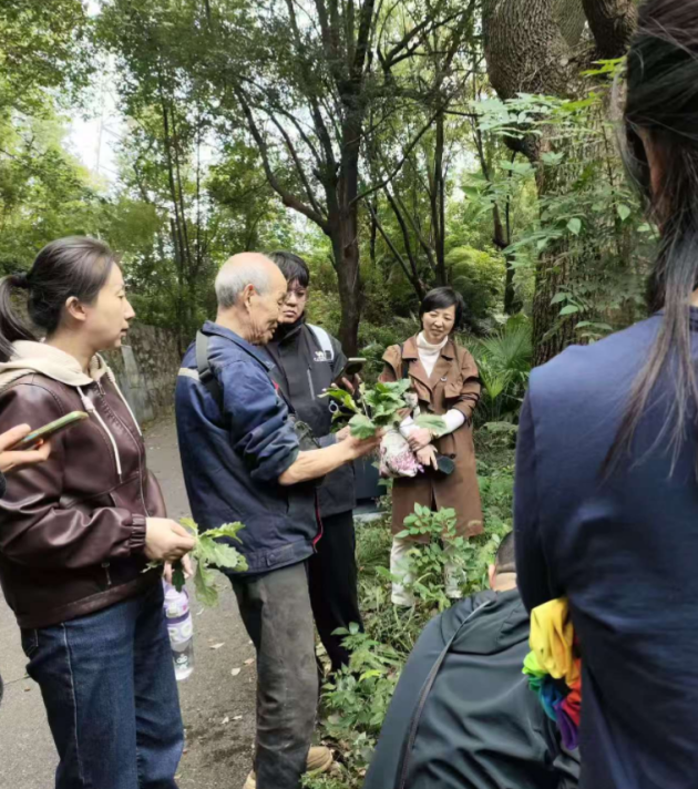 狮子山公园内草木葱郁,是天然的“中药材教学课堂”。由医院药剂科副主任王智友、八十多岁的资深老药师陈汝凤一路带领,同学们在自然环境中解锁着中药材识别的技能。