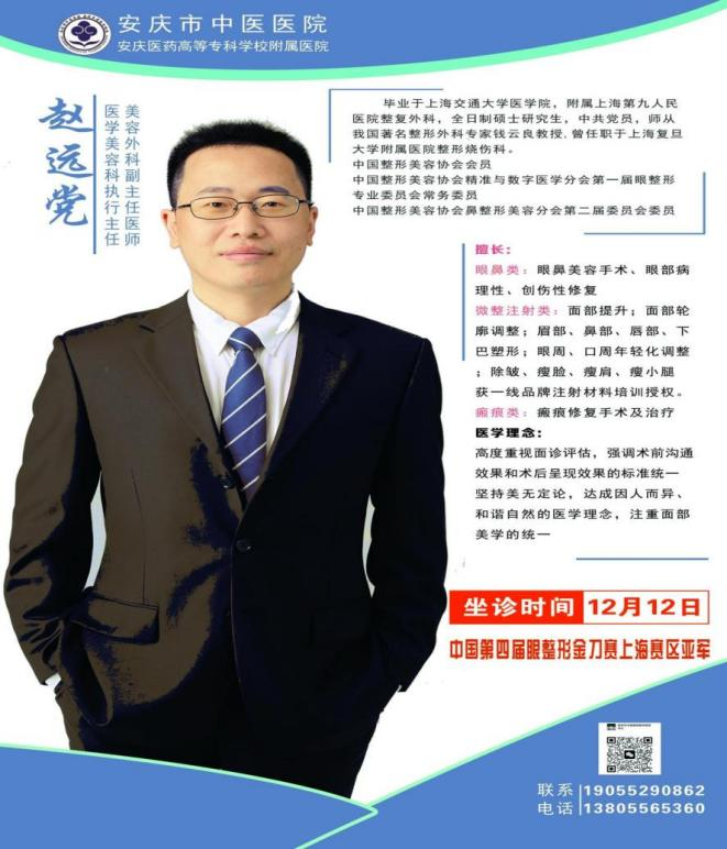 为加强我院医学美容科建设,满足群众日益增长的美好需求,安庆市中医医院聘任知名医美专家赵远党为医学美容科执行主任。赵远党主任在三甲医院工作10余年,曾获“上海眼整形金刀大赛亚军”,拥有丰富的临床经验和学科技术水平。2025年12月12日8:00-17:30,赵远党主任将继续在安庆市中医医院坐诊,欢迎新老朋友相互转告、咨询面诊。