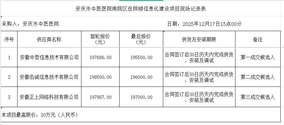 安庆市中医医院南院区住院楼信息化建设项目 成交结果公告