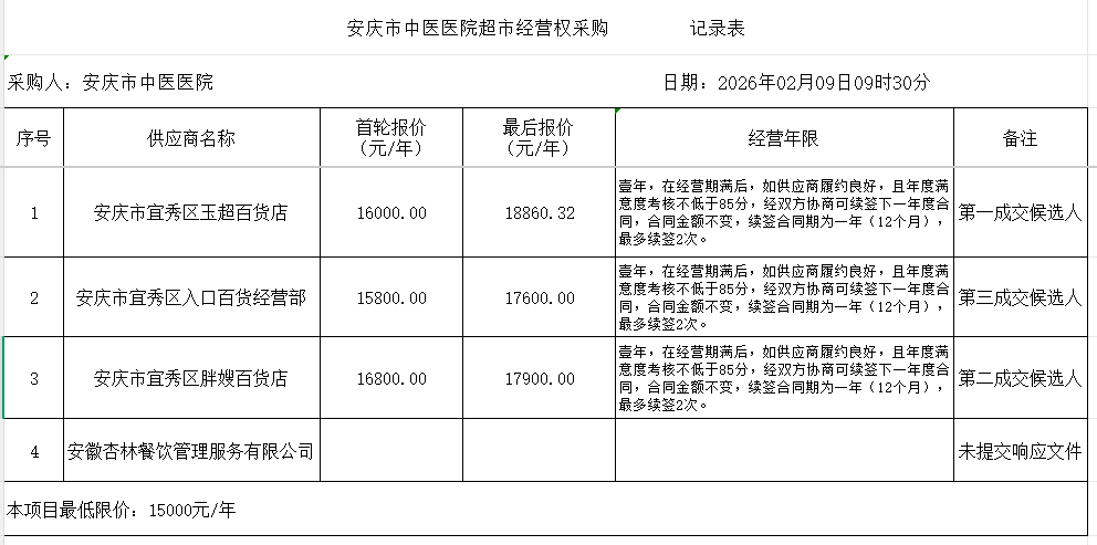 项目名称:安庆市中医医院超市经营权采购 经营年限:壹年,在经营期满后,如供应商履约良好,且年度满意度考核不低于85分,经双方协商可续签下一年度合同,合同金额不变,续签合同期为一年(12个月),最多续签2次。 |