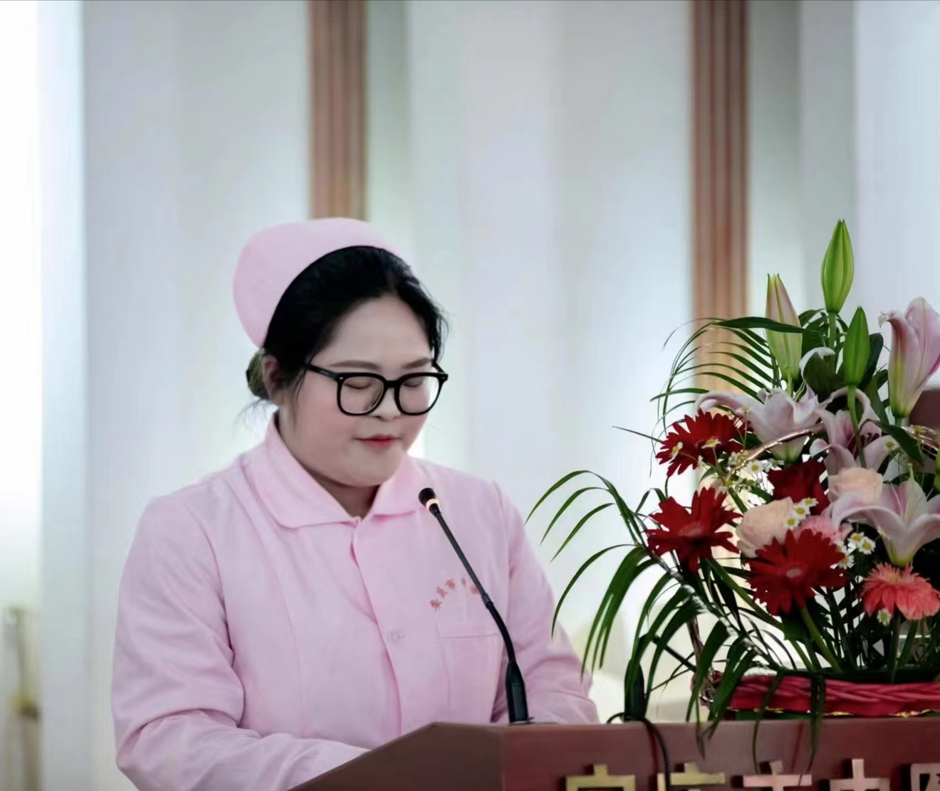 2021年度院级优秀护士代表胡怡发言,表示将传承南丁格尔“人道、博爱、奉献”的精神,努力为患者提供优质、高效温暖的护理服务。