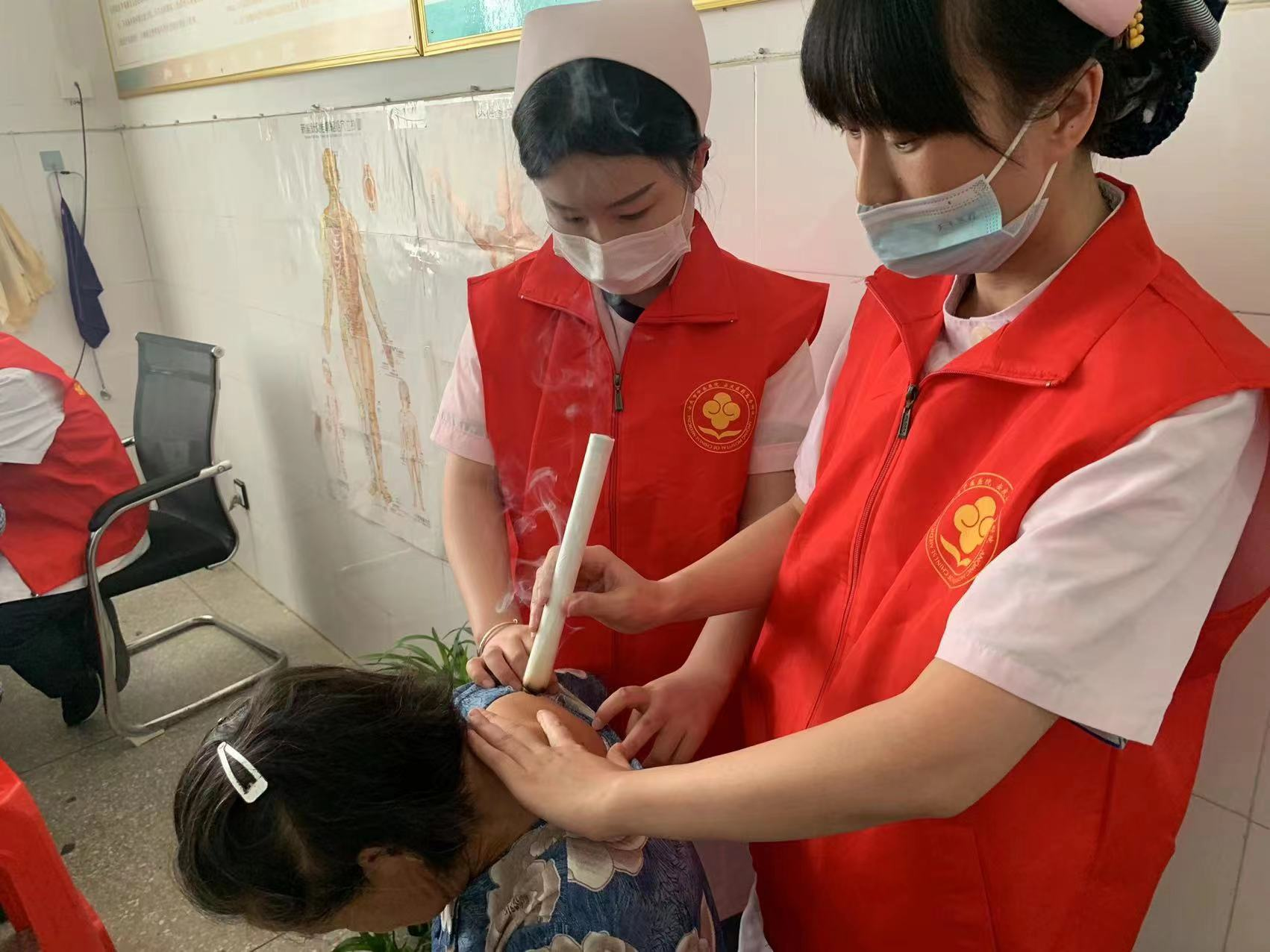中医护理人员为有需要的群众实施耳穴埋豆、艾灸等中医护理疗法,宣传中医药特色文化。