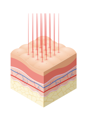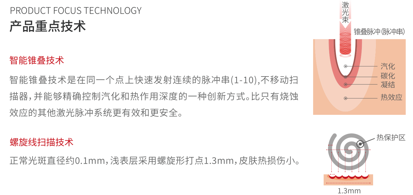核心原理:运用局灶性光热作用原理和点阵模式技术,通过激光的高能量精准聚焦穿透皮肤,将一束激光分成若干规律排列的微小光束,利用10600nm波长的二氧化碳激光作用于皮肤,发射出直径约0.1mm的微孔(点阵),刺激真皮层胶原蛋白的再生和皮肤屏障的修复,促进局部细胞加速更新,改善皮肤质地,达到紧肤嫩肤、祛除色斑的效果。