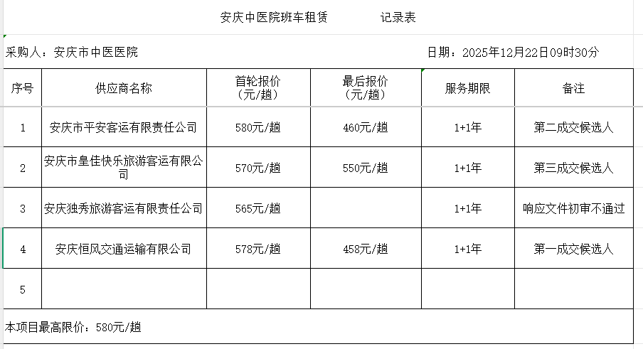 安庆中医院班车租赁成交结果公告